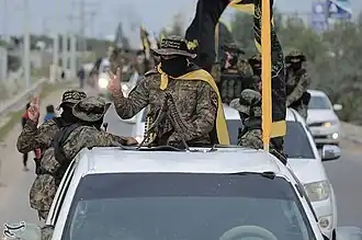 - 7 octobre 2023 : Aux côtés des autres forces armées palestiniennes, attaque en territoire israélien. En une seule journée, plus de 350 soldats et policiers israéliens et plus de 760 civils israéliens sont tués, dans les villes voisines, les kibboutz, les bases militaires et lors d'un festival de musique près de Réïm[32],[33],[34]. Environ 200 civils et soldats israéliens sont capturés afin de les échanger contre des prisonniers palestiniens et sont détenus dans la bande de Gaza, dont une quarantaine d'enfants[35],[33],[36],[37]. Ce même jour, entre 2 500 et 5 000 roquettes sont tirées contre Israël[38],[36].