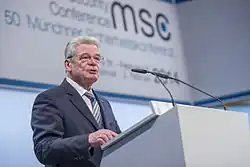 Le , c'est au président de la République fédérale d'Allemagne qu'il revient d'inaugurer la 50e conférence de Munich sur la sécurité, dite « Wehrkunde » ; dans un discours, qu'il prononce devant les invités de la conférence, le président Gauck, évoquant la politique diplomatique assumée par son pays, déclare que, « l'Allemagne n'étant pas une île », celle-ci devait réfléchir aux « conséquences d'une éventuelle inaction diplomatique », enjoignant à ses compatriotes de « ne pas se cacher derrière la culpabilité passée » de l'Allemagne et prônant « une implication plus résolue et plus fondamentale ». Ce discours présidentiel, salué par la presse d'outre-Rhin comme étant l'acte fondateur d'une « affirmation de la politique diplomatique allemande », est alors appuyé par le ministre allemand des Affaires étrangères, Frank-Walter Steinmeier, celui-ci poursuivant que l'Allemagne n'était que « trop grande pour se limiter aux commentaires »[27],[28].