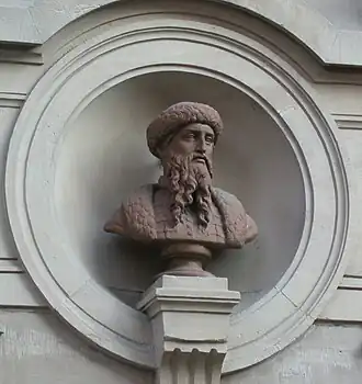 - ↑ Le siège de cette corporation était situé au n°15 de la rue du Dôme, dans la maison dite « À l’Échasse » (en allemand : Zu der Steltzen) où se trouvaient des artistes, des orfèvres, des peintres, des sculpteurs, des peintres verriers, des graveurs, des imprimeurs, et d’autres artisans.