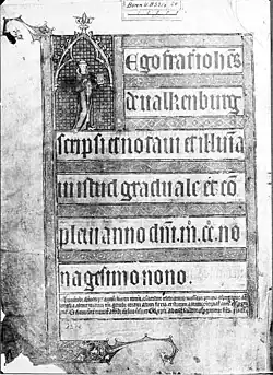 La même année, Valkenburg créé un autre graduel, également doté d'une inscription, qui est aujourd'hui conservée à la bibliothèque universitaire et d'État de Bonn, sous la cote S 384, et qui y figure sous le titre « Graduale des Johannes von Valkenburg »[13]. Il est composé de 316 folios de parchemin, de grande taille 41,5 × 29 cm.