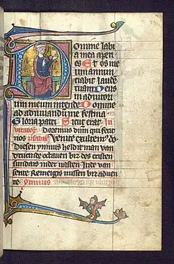 Les bordures avec drôleries, et scènes animales naturalistes, végétales ou toutes sortes d'oiseaux, animaux ou personnages zoomorphes sont très fréquentes. On trouve notamment le thème fréquent déjà dans les enluminures parisiennes, des chiens de chasse poursuivant des lapins, des dragons ailés, enroulés autour de branches ou cachés dans des bourgeons, et le thème du chasseur tirant une flèche en direction d'un animal qui se trouve à belle distance, à moitié de feuille[17]. Les enluminures des initiales ne couvrent, selon le mode en vogue à Paris, qu'un tiers de la largeur d'un page, mais elles sont déjà en général entourées de cadres carrés. Les fonds sont décorés de motifs tapissés, et la feuille d'or est souvent délaissée au profit de couleurs plus vives, le minium, bleu, vert, violet, gris, beige, blanc[18]. Les thèmes des initiales sont :