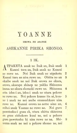 - 1896, Ainu karisia eiwange gusu an inonnoitak oma kambi (The Book of Common Prayer), Londres.
