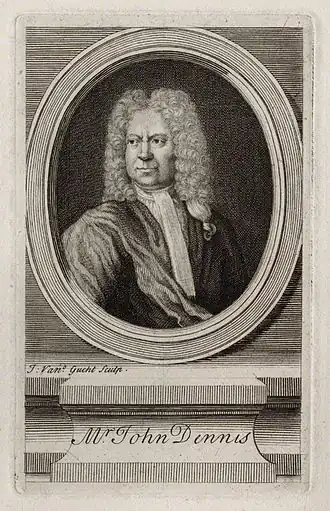 John Dennis (né à Londres le - mort le ) est un critique et un dramaturge anglais de la fin du XVIIe et du début du XVIIIe siècle. Il est considéré, avec John Dryden, comme l'un des fondateurs de la critique textuelle en langue anglaise[1].