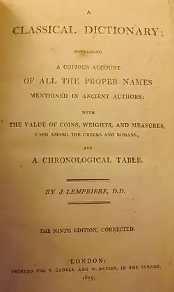 Page de garde de l'édition de 1815 du dictionnaire classique de Lemprière