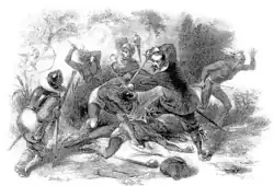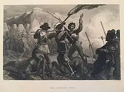 La guerre des Pequots éclata le : aux premières heures de l'aube, des soldats anglais commandés par le capitaine Mason et le lieutenant Robert Seeley attaquèrent avec leurs alliés amérindiens l'un des deux forts des Pequot sur la Mystic River. Les quelque 20 soldats qui forcèrent le portail en rondins furent promptement encerclés et ne durent leur salut qu'au vacarme et à la fumée de leurs arquebuses. L'anecdote[6] attribue au sergent William Hayden de Windsor d'avoir sauvé la vie de Mason en tranchant la corde de l'arc d'un Amérindien qui allait tirer sur lui. Une fois les officiers anglais regroupés, le reste de l'assaut confirma l'encerclement des Pequots, qui furent massacrés : seuls 500 Amérindiens survécurent.