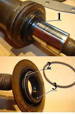 - Pour des mécanismes plus courants comme les boîtes-ponts et sorties de différentiels d’automobiles, la cage du joint à lèvre est vulcanisée ; ce qui permet un démontage et remontage aisé ainsi qu’un positionnement correct sur un alésage sans grande précision.
