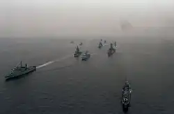 Les navires du groupe de travail 100.1 participent à l'exercice OTAN BALTOPS en octobre 1985. En tête se trouvent les frégates ouest-allemandes Rheinland-Pfalz (F 209), à gauche, et Augsbourg (F 222), à droite, suivies du destroyer ouest-allemand Mölders (D 186), le destroyer britannique HMS Liverpool (D 92), le cuirassé de la marine américaine USS Iowa (BB-61) et le croiseur lance-missiles USS Ticonderoga (CG-47).