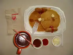 Un petit déjeuner Jollibee (poulet, pancakes, et chocolat chaud).