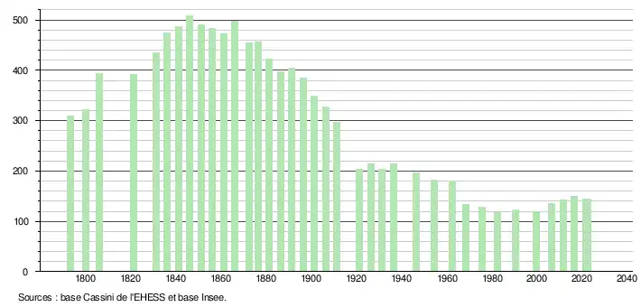 L'évolution du nombre d'habitants est connue à travers les recensements de la population effectués dans la commune depuis 1793. Pour les communes de moins de 10 000 habitants, une enquête de recensement portant sur toute la population est réalisée tous les cinq ans, les populations de référence des années intermédiaires étant quant à elles estimées par interpolation ou extrapolation[23]. Pour la commune, le premier recensement exhaustif entrant dans le cadre du nouveau dispositif a été réalisé en 2006[24].