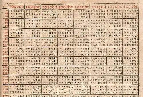 Jost Bürgi pratiquait ce genre de calculs dès le début du XVIIe siècle[30]. Pour certains historiens, Neper et Bürgi sont les co-inventeurs des logarithmes[31],[32], alors que d’autres font une distinction entre la fonction logarithme de Neper et les antilogarithmes de la table de Bürgi où les nombres noirs sont calculés en fonction des rouges.