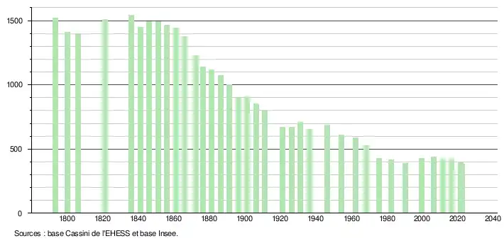 L'évolution du nombre d'habitants est connue à travers les recensements de la population effectués dans la commune depuis 1793. Pour les communes de moins de 10 000 habitants, une enquête de recensement portant sur toute la population est réalisée tous les cinq ans, les populations de référence des années intermédiaires étant quant à elles estimées par interpolation ou extrapolation[31]. Pour la commune, le premier recensement exhaustif entrant dans le cadre du nouveau dispositif a été réalisé en 2006[32].