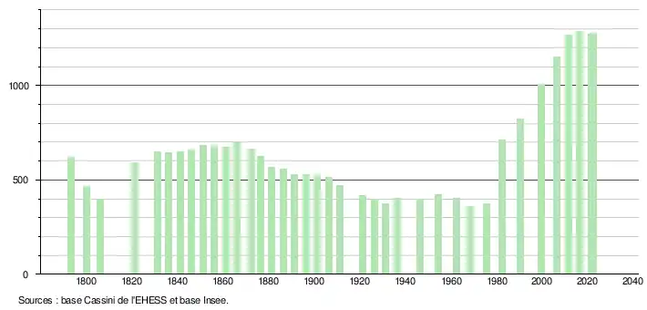 L'évolution du nombre d'habitants est connue à travers les recensements de la population effectués dans la commune depuis 1793. Pour les communes de moins de 10 000 habitants, une enquête de recensement portant sur toute la population est réalisée tous les cinq ans, les populations de référence des années intermédiaires étant quant à elles estimées par interpolation ou extrapolation[24]. Pour la commune, le premier recensement exhaustif entrant dans le cadre du nouveau dispositif a été réalisé en 2006[25].