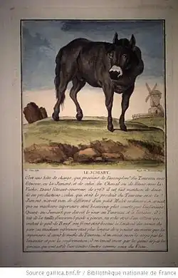 « LE JUMART. C'est une bête de charge, qui provient de l'accouplement du Taureau avec l'Ânesse, ou la Jument, et de celui du Cheval ou de l'Âne avec la Vache. »