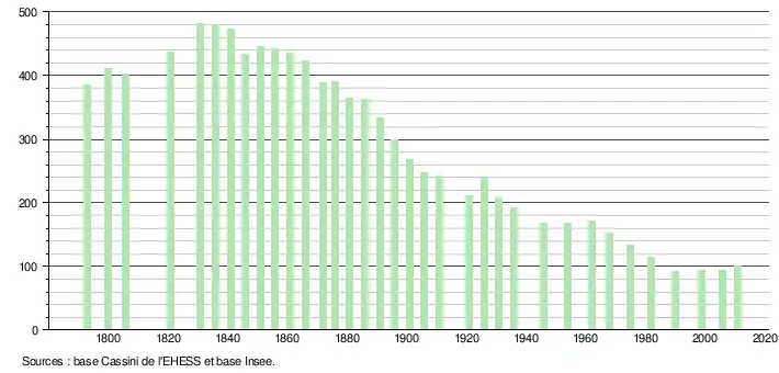 L'évolution du nombre d'habitants est connue à travers les recensements de la population effectués dans la commune depuis 1793. À partir du , les populations légales des communes sont publiées annuellement dans le cadre d'un recensement qui repose désormais sur une collecte d'information annuelle, concernant successivement tous les territoires communaux au cours d'une période de cinq ans. Pour les communes de moins de 10 000 habitants, une enquête de recensement portant sur toute la population est réalisée tous les cinq ans, les populations légales des années intermédiaires étant quant à elles estimées par interpolation ou extrapolation[1]. Pour la commune, le premier recensement exhaustif entrant dans le cadre du nouveau dispositif a été réalisé en 2006[2],[Note 1].