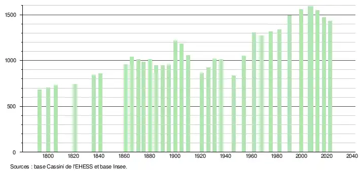 L'évolution du nombre d'habitants est connue à travers les recensements de la population effectués dans la commune depuis 1793. Pour les communes de moins de 10 000 habitants, une enquête de recensement portant sur toute la population est réalisée tous les cinq ans, les populations de référence des années intermédiaires étant quant à elles estimées par interpolation ou extrapolation[19]. Pour la commune, le premier recensement exhaustif entrant dans le cadre du nouveau dispositif a été réalisé en 2007[20].