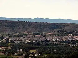 Au premier plan, la place de la Gare. Au second plan, la route départementale D 104 reliant Aubenas à Alès. À l’arrière-plan, le château et l’église. | |||||