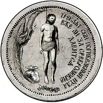 Médaille russe de l'Ordre de Judas avec l'inscription : « Le fils du périssable Judas est anéanti par cupidité » (1709)