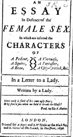 - ↑ En français : Un Essai sur la Défense du Sexe Féminin, dans lequel sont insérés les personnages d'un Pédant, d'un Écuyer, d'un Beau, d'un Vertueux, d'un Poetaster (en), d'un Critique de Ville, etc., dans une lettre à une Lady.