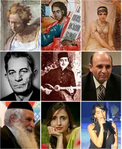 Juifs iraniens célèbres : 1. Daniel, Habakuk, Reine Esther. 2. Solayman Haïm, Morteza Neydavoud (en), Shaul Mofaz. 3. Yousef Hamadani Cohen (en), Roya Hakakian, Rita