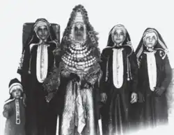 Jeune femmes juives de Sanaa, portant la gargish gadifa, entourant une mariée arborant un tsbuk lulu (1936);