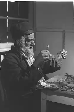 Yosef Yosef, orfèvre yéménite à l'exposition des œuvres des émigrés pour le 10è anniversaire de l'Etat, 1958