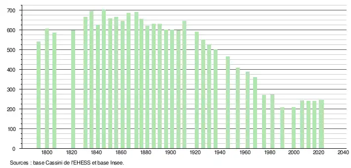 L'évolution du nombre d'habitants est connue à travers les recensements de la population effectués dans la commune depuis 1793. Pour les communes de moins de 10 000 habitants, une enquête de recensement portant sur toute la population est réalisée tous les cinq ans, les populations de référence des années intermédiaires étant quant à elles estimées par interpolation ou extrapolation[13]. Pour la commune, le premier recensement exhaustif entrant dans le cadre du nouveau dispositif a été réalisé en 2006[14].