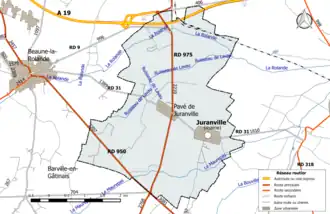 La commune est traversée par l'autoute A19 et trois routes départementales : les RD 950 et 975, deux routes à grande circulation, et la RD 31, une route à faible trafic. Les Charriers ; Pavé-de-Juranville ; Venouille ; Longcourt ; la Motte-Bastille ; les Bordes.