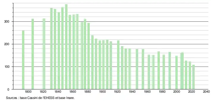 L'évolution du nombre d'habitants est connue à travers les recensements de la population effectués dans la commune depuis 1793. Pour les communes de moins de 10 000 habitants, une enquête de recensement portant sur toute la population est réalisée tous les cinq ans, les populations de référence des années intermédiaires étant quant à elles estimées par interpolation ou extrapolation[17]. Pour la commune, le premier recensement exhaustif entrant dans le cadre du nouveau dispositif a été réalisé en 2007[18].