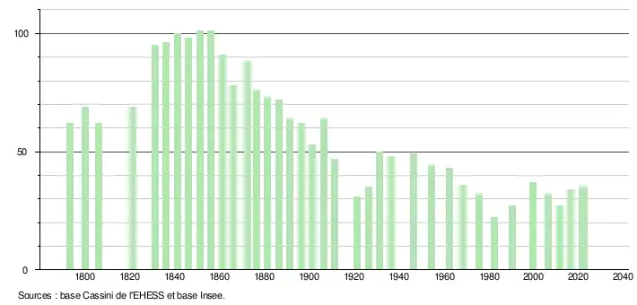 L'évolution du nombre d'habitants est connue à travers les recensements de la population effectués dans la commune depuis 1793. Pour les communes de moins de 10 000 habitants, une enquête de recensement portant sur toute la population est réalisée tous les cinq ans, les populations de référence des années intermédiaires étant quant à elles estimées par interpolation ou extrapolation[16]. Pour la commune, le premier recensement exhaustif entrant dans le cadre du nouveau dispositif a été réalisé en 2006[17].
