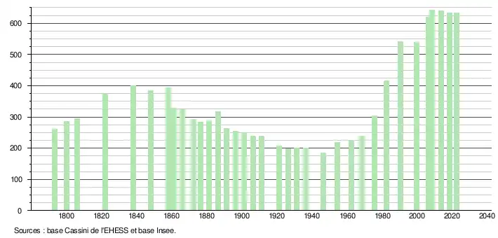 L'évolution du nombre d'habitants est connue à travers les recensements de la population effectués dans la commune depuis 1793. Pour les communes de moins de 10 000 habitants, une enquête de recensement portant sur toute la population est réalisée tous les cinq ans, les populations de référence des années intermédiaires étant quant à elles estimées par interpolation ou extrapolation[14]. Pour la commune, le premier recensement exhaustif entrant dans le cadre du nouveau dispositif a été réalisé en 2008[15].