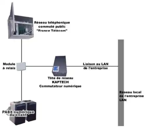 - La « tête de réseau ». Il s’agit d’un boîtier (PC sous LINUX avec des cartes RNIS) qui se place, dans l’entreprise cliente, entre le PABX d’un côté et les accès Numéris (ISDN) France Télécom de l’autre. Le boîtier déroute les appels sortants de l’entreprise pour les acheminer sur le réseau Kapt’. La tête de réseau va contourner les limitations introduites par France Telecom sur les mécanismes de sélection du transporteur pour permettre le routage de tous les types d’appels. En effet, à cette époque, les appels locaux et les appels vers les mobiles ne sont pas éligibles à la sélection de l’opérateur par préfixe (le 7 de Cegetel, par exemple, ne permet pas de joindre les mobiles), problème que la tête de réseau contourne.