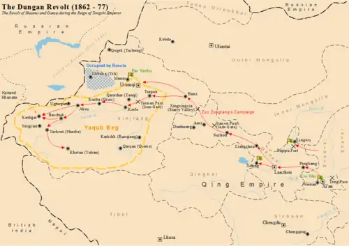 Profitant de la concurrence entre Chine, empire Ottoman, Russie et Grande-Bretagne, Yakoub Beg signa des traités avec ces dernières puissances et obtint des armes de l'empire ottoman, mais fut impuissant à décider ses partenaires à le soutenir effectivement contre la première. Les forces chinoises, menées par le général Zuo Zongtang, entamèrent la reconquête et défirent les forces de Yakoub Beg[2].