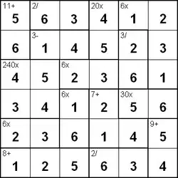 La grille est constituée d'un nombre égal de lignes et de colonnes contenant des blocs de deux ou trois cases délimitées par un épais trait noir. Le chiffre inscrit en haut à gauche de chaque bloc est le résultat de l'opération (addition, soustraction, multiplication, division) effectuée avec les chiffres des deux ou trois cases d'un même bloc.