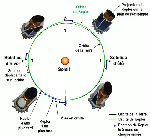 Pour atteindre les objectifs, la région de l'espace observée par Kepler ne doit pas être obstruée périodiquement, comme elle le serait si le télescope spatial circulait sur une orbite terrestre (occultations par la Terre, pollution lumineuse). Compte tenu de cette contrainte, l'orbite la plus facile à atteindre (nécessitant le lanceur le moins puissant) est une orbite héliocentrique (autour du Soleil) à la même distance de l'astre que la Terre. La période orbitale de l'orbite retenue est de 372,5 jours. Le satellite circule à l’arrière de la Terre en s'éloignant progressivement de celle-ci. La distance croissante est toutefois compatible en fin de mission primaire avec le débit requis pour le transfert des données. Cette orbite évite les ceintures de radiation de la Terre et les perturbations gravitationnelles et cinétiques inhérentes à l'orbite terrestre. Les seules forces qui s'exercent sur le satellite sont celles produites par la poussée des photons du Soleil sur le corps du satellite. Sur cette orbite, Kepler n'a besoin que de très peu d'ergol pour maintenir une orientation compatible avec les objectifs[29],[30].