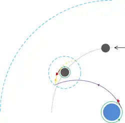 Exemple de trajectoire dans le modèle simplifié de mécanique spatiale utilisé par le jeu. Les sphères d'influence sont représentées en pointillés bleus.