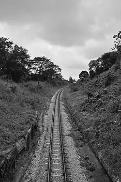 Intercité tractée par une locomotive diesel sur la voie unique au nord de Singapour.