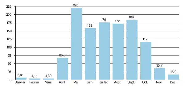 Le débit moyen mensuel observé en février (minimum d'étiage) est de 4,11 m3/s, soit moins de 2 % du débit moyen du mois de mai (220 m3/s), ce qui souligne l'amplitude très élevée des variations saisonnières. Sur la durée d'observation de 62 ans, le débit mensuel minimal a été de 0,020 m3/s (vingt litres) en , tandis que le débit mensuel maximal s'élevait à 562 m3/s en .