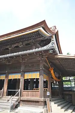 Le honden est relié à l'avant au haiden par un passage de 1 × 1 baie et un court escalier. Le moya du haiden fait juste 3 × 1 baies, mais il est entouré sur trois côtés par le mokoshi (toit recourbé) d'une baie de large, ce qui porte les dimensions extérieures du bâtiment à 4 × 4 baies. Les deux entrées du haiden se trouvent sur le côté pignon (style (tsumairi).