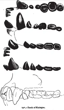 Comme celle du coati, sa denture, caractérisée particulièrement par deux canines inférieures très saillantes et des prémolaires et molaires inaptes à la mastication, lui vaut l'appellation de carnivore, mais à la différence de cet autre procyonidé, il n'est pas carnassier et se nourrit d'une façon assez similaire à celle du singe-araignée d'au moins trente-sept sortes de fruits différentes, moins d'un dixième de son alimentation se composant de feuilles et de fleurs[23]. Son régime est celui d'un opportuniste et se révèle très variable selon les saisons et les régions.