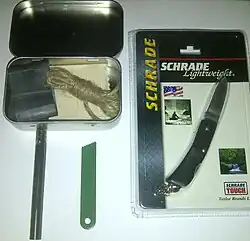 Un kit de survie peut contenir des fournitures multifonctions comme : un couteau (souvent un couteau suisse), une lampe de poche, du cordage, un kit de couture.