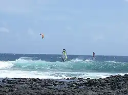 Kitesurfeurs et véliplanchistes coexistent à la Ravine Blanche à Saint-Pierre (La Réunion) en 2010.
