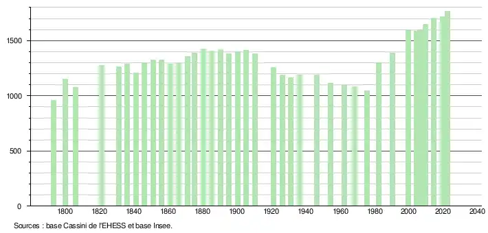 L'évolution du nombre d'habitants est connue à travers les recensements de la population effectués dans la commune depuis 1793. Pour les communes de moins de 10 000 habitants, une enquête de recensement portant sur toute la population est réalisée tous les cinq ans, les populations de référence des années intermédiaires étant quant à elles estimées par interpolation ou extrapolation[26]. Pour la commune, le premier recensement exhaustif entrant dans le cadre du nouveau dispositif a été réalisé en 2004[27].