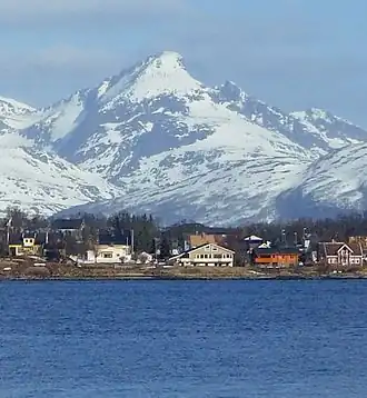 Kvaløya vu de Tromsø (au premier plan, l'aéroport de Tromsø). | |