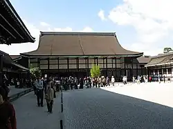 • le Kogosho (小御所, « salle d'audience »), fut reconstruit en 1959 à la suite d'un incendie provoqué par un feu d'artifice. C'est un lieu où l’empereur recevait des bannerets sous le contrôle direct du shogun Tokugawa. Il était également utilisé pour certains rituels religieux. Ce bâtiment distinctif présente un mélange d’éléments architecturaux des styles shinden zukuri et shoin zukuri.