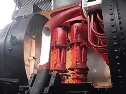 Boîte à fumée découpée avec un double échappement Kylchap de la Renfe 141F 2416 au musée ferroviaire Delicias, Madrid.