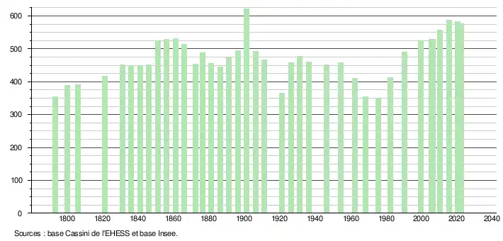 L'évolution du nombre d'habitants est connue à travers les recensements de la population effectués dans la commune depuis 1793. Pour les communes de moins de 10 000 habitants, une enquête de recensement portant sur toute la population est réalisée tous les cinq ans, les populations de référence des années intermédiaires étant quant à elles estimées par interpolation ou extrapolation[50]. Pour la commune, le premier recensement exhaustif entrant dans le cadre du nouveau dispositif a été réalisé en 2005[51].