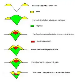 Après les orages, il mélange les végétaux pour faciliter la fermentation et si les conditions le permettent, creuse en août, à la fin de l'hiver austral, une cavité pour placer les œufs. La femelle l'aide quelquefois à creuser cette niche et le planning de ces travaux est fonction des conditions climatiques (température et précipitations). La femelle va pondre entre septembre et février en fonction des précipitations. Elle attend d'avoir la température voulue par une fermentation suffisante. Pendant ce temps le mâle continue de s'occuper de l'entretien en prenant la température du nid avec son bec et sa langue, ajoutant régulièrement de la terre le matin au fur et à mesure que l'été arrive pour l'isoler de la chaleur du soleil, dégageant de la terre lorsque la fermentation s'emballe pour faire des courants d'air, faire baisser la température et ralentir la fermentation, tout cela pour maintenir la température constante (33 °C à moins d'un degré près)