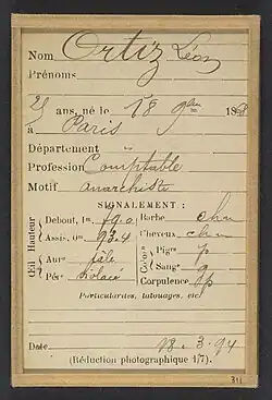 - ↑ Alphonse Bertillon, Chiroki. Eva (veuve Ortiz). 53 ans, née à Grosbitlech (Autriche). Cuisinière. Anarchiste. 21/3/94., (lire en ligne)