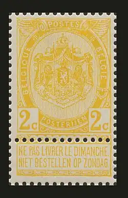 À partir de 1893, tous les timbres belges voient l'apparition d'une bandelette bilingue se-tenant « NE PAS LIVRER LE DIMANCHE - NIET BESTELLEN OP ZONDAG». Enlevée, elle signifie que l'expéditeur souhaitait une livraison, y compris ce jour férié. Cette initiative unique est à porter au mérite du ministre des chemins de fer, des postes et du télégraphe Jules Vandenpeereboom qui a également introduit les mentions bilingues sur les timbres belges. Le but de cette bandelette était de diminuer la charge de travail des facteurs le dimanche. Le Catalogue officiel de timbres-poste signale que les timbres sans cette bandelette ont une cote fortement minorée sauf s'ils sont sur lettre ou document. Cette bandelette fut abandonnée avant la Première Guerre mondiale. Les effigies royales côtoyaient quatre petites valeurs aux armoiries de la Belgique.