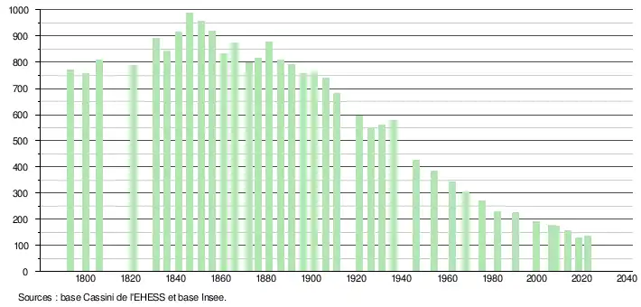 L'évolution du nombre d'habitants est connue à travers les recensements de la population effectués dans la commune depuis 1793. Pour les communes de moins de 10 000 habitants, une enquête de recensement portant sur toute la population est réalisée tous les cinq ans, les populations de référence des années intermédiaires étant quant à elles estimées par interpolation ou extrapolation[30]. Pour la commune, le premier recensement exhaustif entrant dans le cadre du nouveau dispositif a été réalisé en 2008[31].